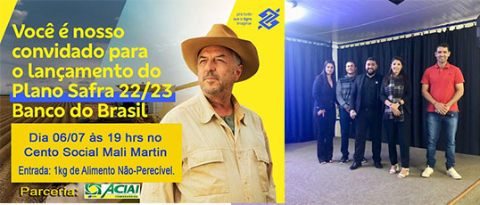 O BANCO DO BRASIL em parceria com a ACIAI CDL/CMEI realizou um evento de lançamento do Plano Safra 2022/2023. O Plano Safra é um programa do Governo Federal que destina recursos ao financiamento da atividade agropecuária de pequenos, médios e grandes produtores, incluídos como cooperativas e agroindústrias. O evento ocorreu no Centro Social Mali Martim no dia 06 de julho e contou com a participação de vários empresários da cidade. Na oportunidade foi recolhido na entrada 1 Kg de alimento não perecível para ajudar as instituições locais. Na mesma data do evento foi realizada uma entrevista na Radio Millenium para esclarecimentos sobre o evento e para convidar os participantes. Os participantes da entrevista foram Marcone Gomes, gerente da Aciai e Jeferson Ferreira gerente do Banco do Brasil.