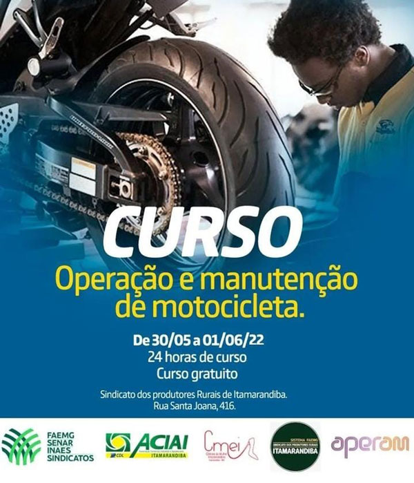 O mês de maio foi finalizado com mais um curso profissionalizante, dessa vez foi o de Operação e manutenção de motocicletas. O curso aconteceu nos dias 30 de maio a 01 de junho, no Sindicato dos produtores Rurais de Itamarandiba. Com o apoio do Senar, Sindicado dos produtores rurais e Aperam Bioenergia.